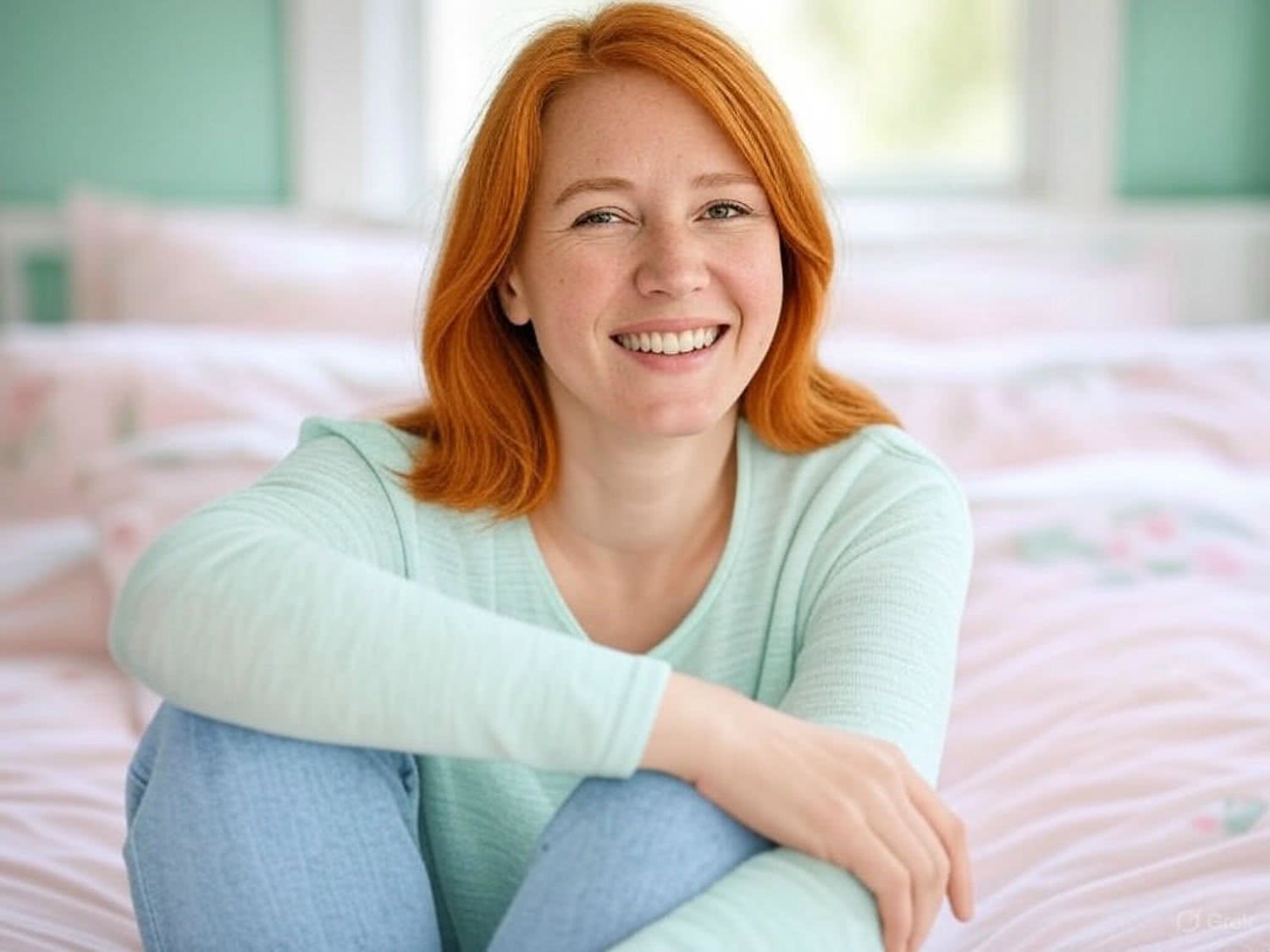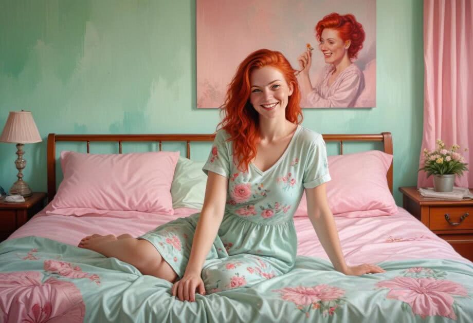 Retro-inspired vibrant oil painting and aerosol graph highly detailed digital image with soft vintage-effect. SCENE: of a young woman in her mid-30s with Slavic features and red hair, smiling optimistically. She is sitting relaxed on a bed in a light mint-colored bedroom. The bed features light pink cotton bedding with subtle floral patterns. Natural light streams through a window, creating a fresh and spring-like atmosphere. The room is softly lit, enhancing the serene and peaceful mood without any additional distracting elements. The focus is primarily on her face, ensuring a close-up shot that captures her expression clearly. The overall composition emphasizes the woman and the tranquil, inviting setting of the bedroom. IMAGE STYLE: The artwork has a retro color palette with warm orange, earthy green and sky blue, featuring rusted edges for an aged look. The text reads: 'Bedroom’ The overall style mimics classic mid-century advertising with a humorous twist