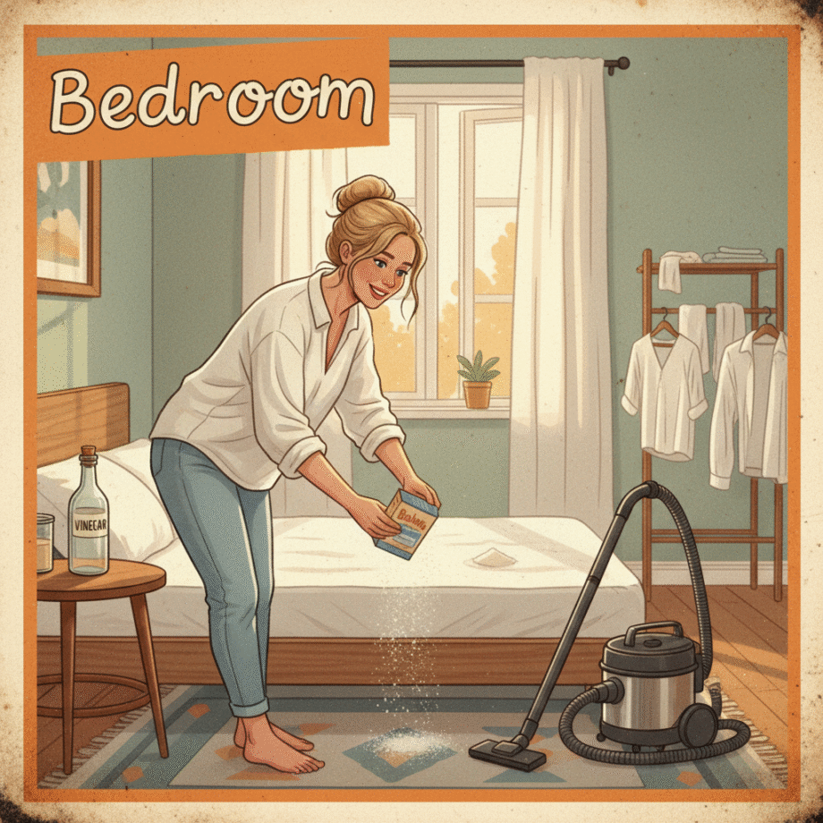 Retro-inspired vibrant oil painting and aerosol graph highly detailed digital image with soft vintage-effect. Scene: of a smiling woman in her mid-30s with Slavic features, light blond hair in a loose bun, and blue eyes, wearing a loose white blouse and jeans. She is in a bright, cozy Scandinavian-style bedroom with wooden furniture, lightly sprinkling baking soda on a clean, white mattress. Nearby, a vacuum cleaner with a brush attachment and a bottle of vinegar are visible. The background features an open window with soft sunlight and fresh laundry on a drying rack, contributing to a fresh and relaxed atmosphere. The scene is depicted in warm, pastel colors, ensuring it is safe for all audiences. IMAGE STYLE: The artwork has a retro color palette with warm orange, earthy green and sky blue, featuring rusted edges for an aged look. The text reads: 'Bedroom’ The overall style mimics classic mid-century advertising with a humorous twist