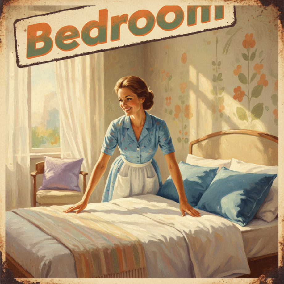 Retro-inspired vibrant oil painting and aerosol graph highly detailed digital image with soft vintage-effect. Scene: of a young woman in her mid-30s with Slavic features and a slender build, standing in a bright, cozy bedroom. She has a relaxed smile and is gently smoothing the perfectly made bed, which is covered with a white sheet, blue pillows, and a light pastel-colored throw. Natural morning light streams through a window, illuminating the scene softly. The background includes subtle decorative elements like a lavender pillow and sheer curtains, maintaining a warm, peaceful atmosphere. The overall composition focuses on the woman and the bed, with no distracting elements, creating a serene and inviting setting. IMAGE STYLE: The artwork has a retro color palette with warm orange, earthy green and sky blue, featuring rusted edges for an aged look. The text reads: 'Bedroom’ The overall style mimics classic mid-century advertising with a humorous twist