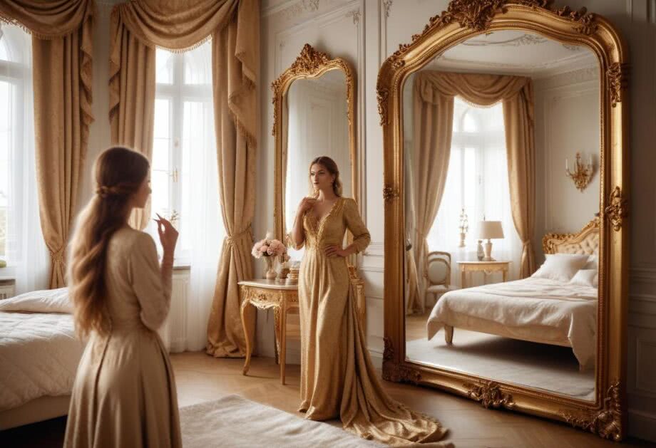 Zdjęcie sypialni w stylu glamour z dużym lustrem o bogato zdobionej złotej ramie, ustawionym naprzeciwko okna, które odbija światło dzienne. W tle widoczna jest kobieta o słowiańskiej urodzie, elegancko ubrana, przeglądająca się w lustrze.