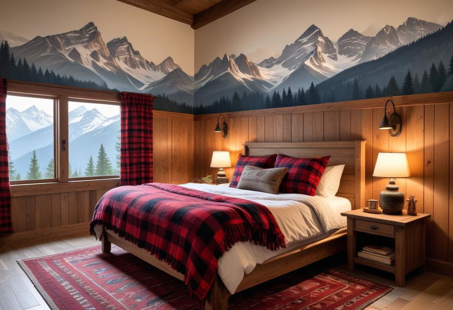Sypialnia w stylu górskim z drewnianymi wykończeniami, jasnymi deskami na podłodze, łóżkiem z solidnymi ramami, pledem w czerwono-czarną kratę przewieszonym przez nogi łóżka, tapetą z widokiem na majestatyczne szczyty Alp za łóżkiem, rustykalnym lampionem na stoliku nocnym oraz dużą doniczkową rośliną o dużych liściach w kącie pokoju.