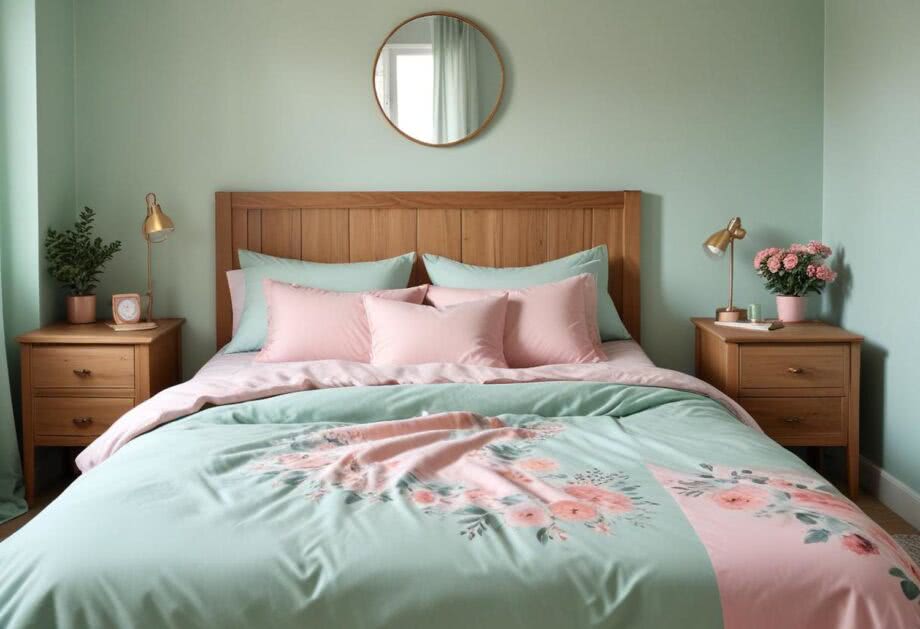 Mała sypialnia w stylu vintage z kompaktowym łóżkiem z wysokim zagłówkiem i metalowymi elementami, pastelowymi dodatkami jak pościel w odcieniach mięty i różu, kwiatowe wzory na poduszkach i narzutach z naturalnych materiałów, klasyczne ramki na zdjęcia oraz dekoracyjne lustro z drewnianą ramą umieszczone naprzeciwko okna; wnętrze urządzone przez młodą Polkę o słowiańskiej urodzie.