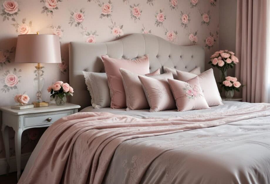 Zdjęcie sypialni w stylu romantycznym z miękkimi tkaninami w pastelowych kolorach, takich jak różowy i szary. Na łóżku leży jedwabna pościel w odcieniu bladego różu oraz narzuta z weluru w szarościach. Wokół są liczne poduszki dekoracyjne w pastelowych barwach i szarościach, niektóre z koronką lub haftem. Na stoliku nocnym stoi bukiet świeżych róż, a na ścianie widoczna jest tapeta z delikatnym wzorem pąków różanych. Subtelne oświetlenie pochodzi z lampek nocnych z abażurami wykonanymi z delikatnych materiałów oraz zapalonych świec zapachowych o aromacie róży. Na ścianie naprzeciwko łóżka znajduje się lustro w ozdobnej ramie z motywami kwiatowymi, a na komodzie stoi ramka ze zdjęciem młodej pary – kobiety o długich blond włosach i mężczyzny bruneta o głębokim spojrzeniu.
