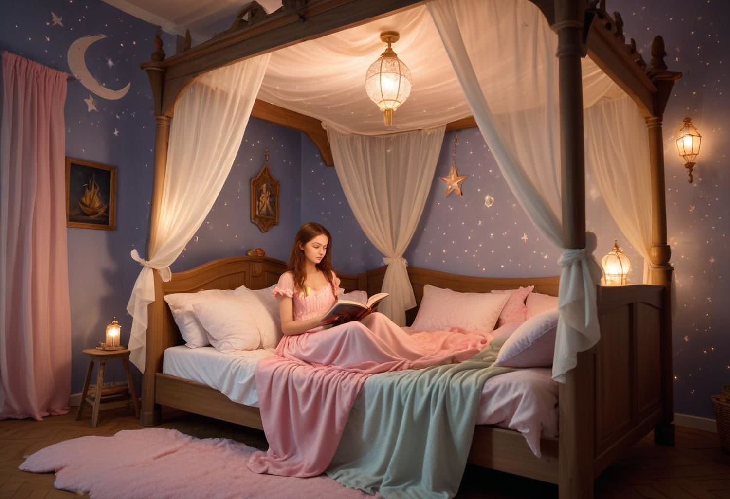 A high-resolution photograph of a young woman with Slavic features, dressed in a pastel-colored nightgown, sitting on a uniquely shaped bed resembling a pirate ship, reading a fairy tale book. The bedroom features a light, pastel-colored canopy with star and moon-shaped lanterns hanging above the bed. The walls are adorned with fairy tale illustrations, and there is a soft rug beside the bed. A shelf with a collection of fairy tale books is visible next to the bed. The room is softly lit, creating a cozy and dreamy atmosphere, with no distracting elements in the background, ensuring the focus remains on the woman and the serene, fairy tale-inspired setting.