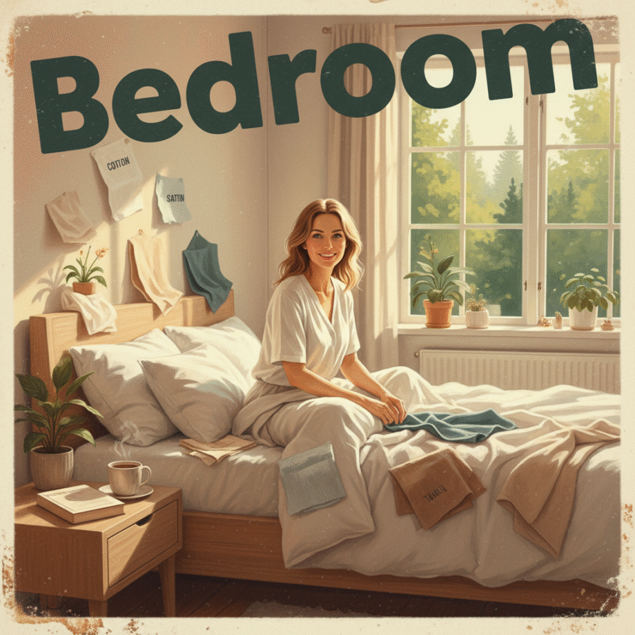 Retro-inspired vibrant oil painting and aerosol graph highly detailed digital image with soft vintage-effect. Scene: of a smiling woman in her mid-30s with light hair and delicate Slavic features, sitting on a bed with soft bedding in shades of white and beige in a cozy, Scandinavian-style bedroom. She is surrounded by various fabric samples including smooth cotton, rustic linen, shiny satin, soft microfiber, and eco-friendly tencel. On a bedside table, there is an open book and a cup of tea. Soft morning light enters through a window with a view of a green forest. The room has a warm, inviting atmosphere with natural lighting and minimalist decor, ensuring a safe and elegant environment without explicit content. IMAGE STYLE: The artwork has a retro color palette with warm orange, earthy green and sky blue, featuring rusted edges for an aged look. The text reads: 'Bedroom’ The overall style mimics classic mid-century advertising with a humorous twist