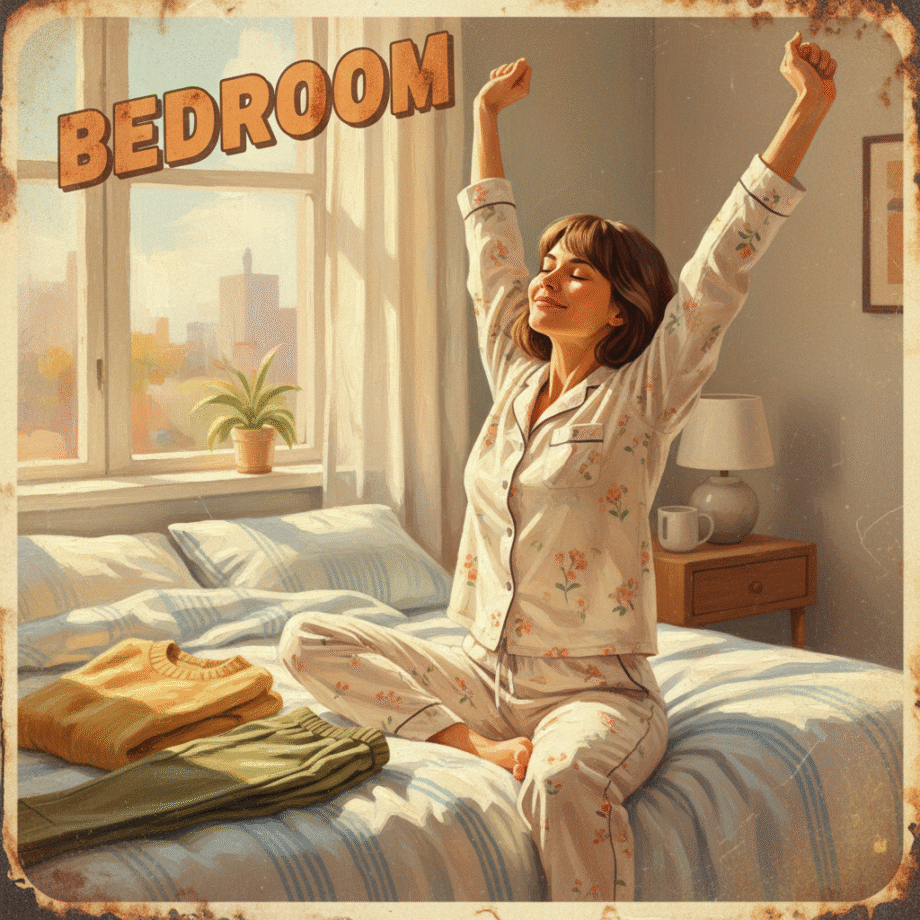 Retro-inspired vibrant oil painting and aerosol graph highly detailed digital image with soft vintage-effect. Scene: of a young woman in her mid-30s with Slavic features, warm brown hair, and a gentle smile, sitting on the edge of a bed in a cozy, sunlit bedroom. She is wearing a comfortable cotton pajama set and is stretching her arms with a sense of energy and joy. Next to her on the bed lies a stylish outfit for the day, consisting of a loose sweater and fitted pants. The room is bathed in soft morning sunlight, creating a warm and inviting atmosphere. The decor includes light-colored bedding and a wooden nightstand with a small lamp, maintaining a clutter-free and serene environment. The overall composition focuses on her, highlighting her positivity and readiness for a creative, productive day, set in a realistic style with warm, earthy tones. IMAGE STYLE: The artwork has a retro color palette with warm orange, earthy green and sky blue, featuring rusted edges for an aged look. The text reads: 'Bedroom’ The overall style mimics classic mid-century advertising with a humorous twist