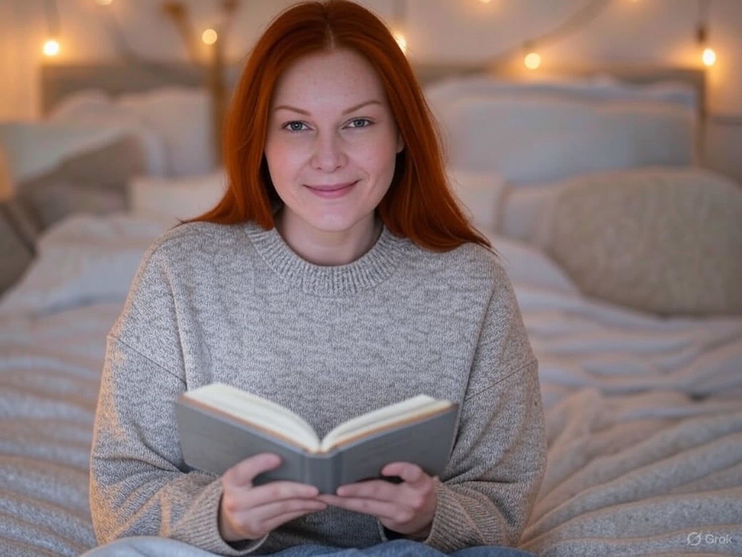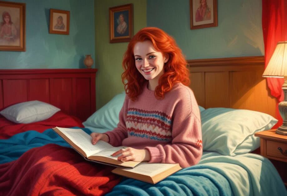Retro-inspired vibrant oil painting and aerosol graph highly detailed digital image with soft vintage-effect. SCENE: of a woman in her mid-30s with Slavic features and red hair, smiling gently and holding an open book. She is dressed in a comfortable sweater and is seated on a plush bed in a cozy, warmly lit bedroom. The room features soft, warm lighting from string lights hung above the bed, creating a welcoming winter atmosphere. The background includes subtle details like soft textiles and possibly a window with gentle winter scenery, ensuring the focus remains on the woman. The overall composition is intimate and serene, emphasizing the woman’s relaxed and content expression. IMAGE STYLE: The artwork has a retro color palette with warm orange, earthy green and sky blue, featuring rusted edges for an aged look. The text reads: 'Bedroom’ The overall style mimics classic mid-century advertising with a humorous twist