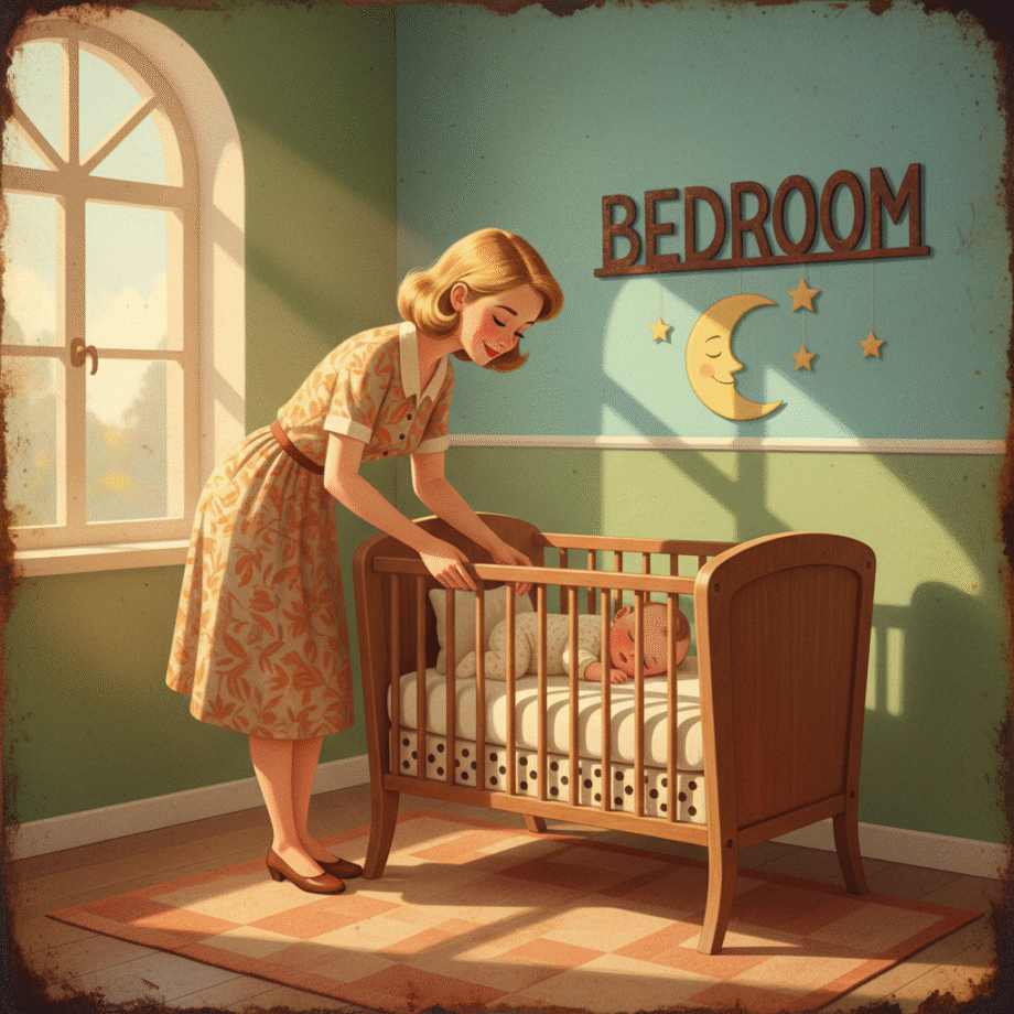 Retro-inspired vibrant oil painting and aerosol graph highly detailed digital image with soft vintage-effect. Scene: of a young, smiling Polish mother in her early 30s with light blonde hair and delicate facial features, gently arranging her sleeping baby with rosy cheeks and light locks in a cozy crib. The baby is dressed in a soft, light-colored onesie. The nursery features pastel-colored walls and is lit by soft, natural sunlight coming through a window, creating a warm and comforting atmosphere. The crib has a hard, ventilated mattress made from natural materials. The room is decorated minimally to maintain focus on the mother and baby, with no distracting elements or risks present. The overall mood is serene and familial, emphasizing safety and tranquility. IMAGE STYLE: The artwork has a retro color palette with warm orange, earthy green and sky blue, featuring rusted edges for an aged look. The text reads: 'Bedroom’ The overall style mimics classic mid-century advertising with a humorous twist