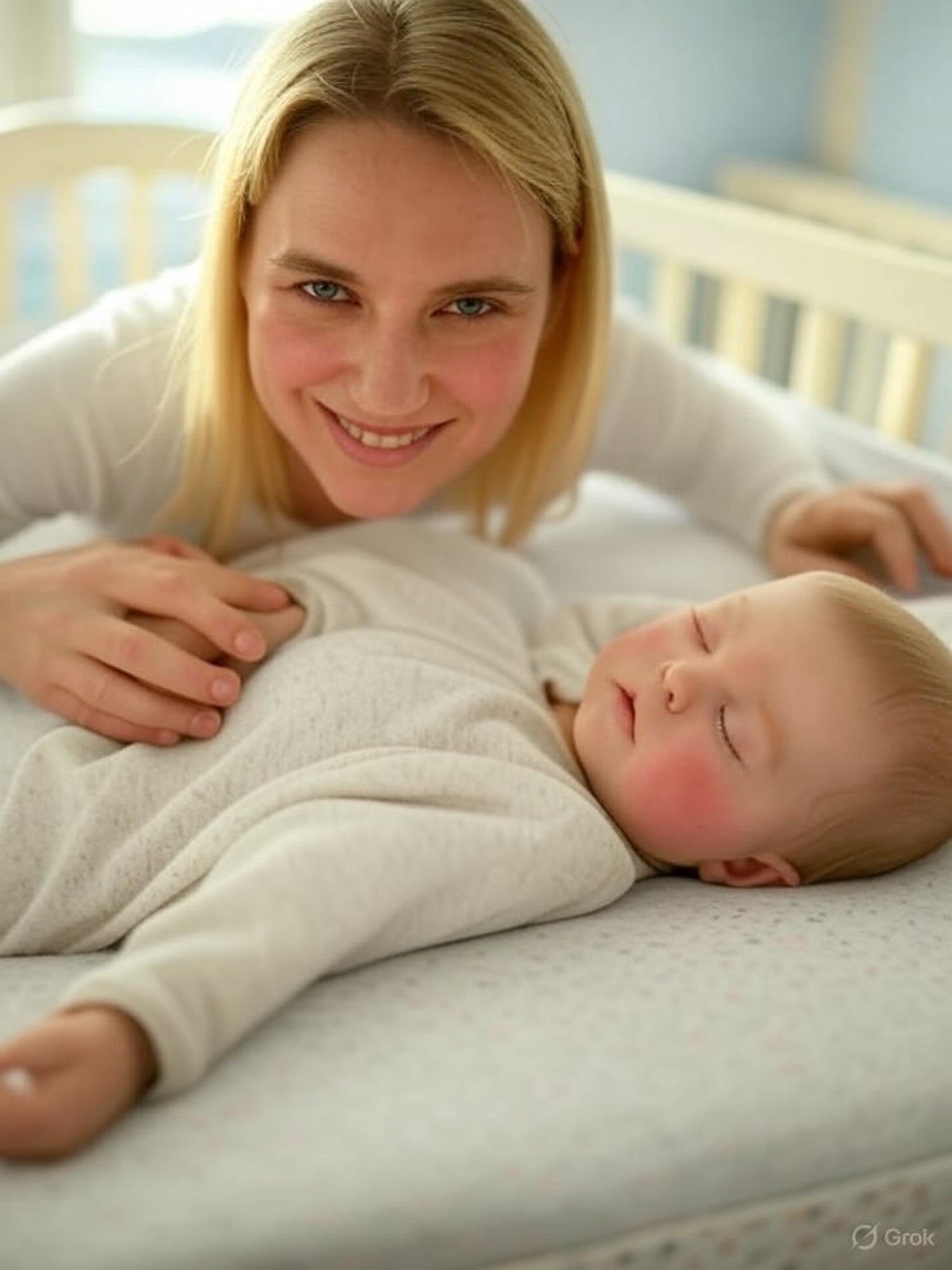 Ilustracja realistyczna: szczęśliwa młoda matka o słowiańskiej urodzie, Polka w wieku około 30 lat, z jasnymi blond włosami i delikatnymi rysami twarzy, delikatnie układa śpiące niemowlę o rumianych policzkach i jasnych loczkach w przytulnym łóżeczku z twardym, wentylowanym materacem z naturalnych materiałów. Pokój dziecięcy w jasnych pastelowych kolorach, z miękkim światłem słonecznym, podkreślającym bezpieczeństwo, komfort i spokój; styl ciepły, rodzinny, bez elementów ryzyka.