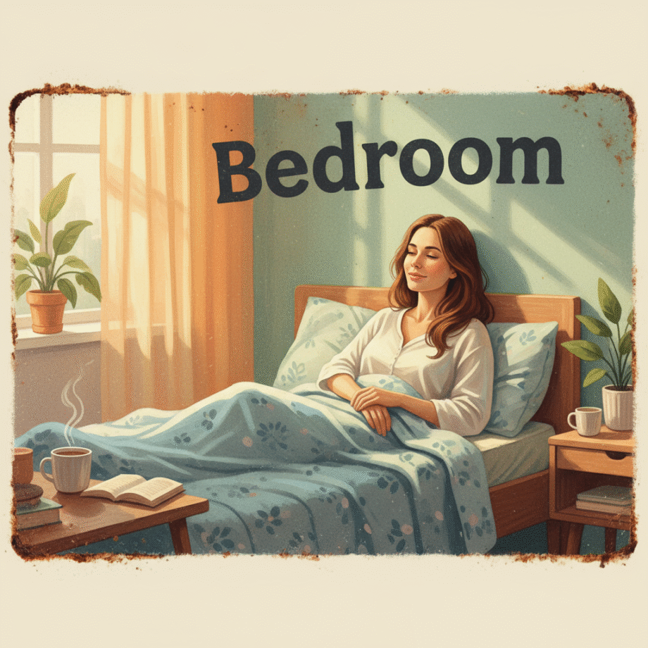 Retro-inspired vibrant oil painting and aerosol graph highly detailed digital image with soft vintage-effect. Scene: of a young woman in her mid-30s with Slavic features, light skin, and a cascade of chestnut hair, lying in a comfortable bed with light blue and gray bedding in a Scandinavian-style bedroom. She has a gentle, refreshed smile and is wearing a loose, light-colored nightshirt. The room is softly lit by morning light filtering through a nearby window, creating a warm and inviting atmosphere. On a bedside table, there is a cup of melissa tea and a book. The decor includes minimalist wooden furniture and subtle greenery, maintaining a focus on the woman’s serene expression and the tranquil setting. IMAGE STYLE: The artwork has a retro color palette with warm orange, earthy green and sky blue, featuring rusted edges for an aged look. The text reads: 'Bedroom’ The overall style mimics classic mid-century advertising with a humorous twist