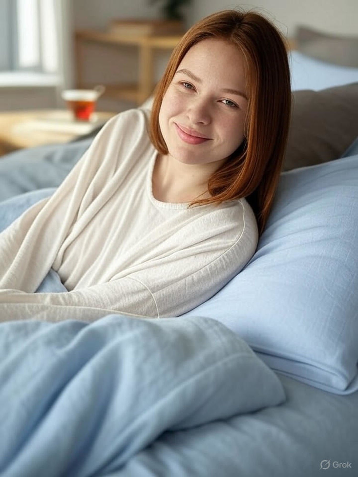 Młoda kobieta o słowiańskiej urodzie, około 35 lat, z jasną cerą, burzą kasztanowych włosów i delikatnym uśmiechem, budzi się wypoczęta w jasnej, przytulnej sypialni o skandynawskim stylu. Leży w wygodnym łóżku z miękką pościelą w odcieniach bieli i granatu, z promienną, świeżej skórą bez oznak zmęczenia, w luźnej koszuli nocnej. Obok na stoliku stoi filiżanka herbaty z melisy i książka, a przez okno wpada delikatne poranne światło, symbolizujące energię i blask po dobrym śnie. Ilustracja w stylu realistycznym, ciepłe kolory, atmosfera relaksu i witalności.