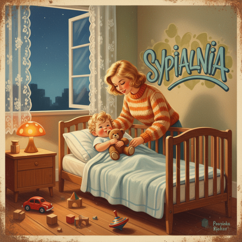 Retro-inspired vibrant oil painting and aerosol graph highly detailed digital image with soft vintage-effect. Scene: of a young Polish mother with light hair and delicate features, wearing a simple home-knit sweater, gently tucking her three-year-old son into bed. The boy, with rosy cheeks and blond curls, is cuddling a plush teddy bear and lies on a comfortably medium-firm mattress in a wooden crib with light-colored bedding. The cozy bedroom is softly lit by a nightstand lamp, with scattered toys on the floor and an open window in the background suggesting a peaceful evening. The atmosphere is warm, safe, and full of love, emphasizing a comforting bedtime routine for the young explorer. IMAGE STYLE: The artwork has a retro color palette with warm orange, earthy green and sky blue, featuring rusted edges for an aged look. The text reads: 'Bedroom’ The overall style mimics classic mid-century advertising with a humorous twist