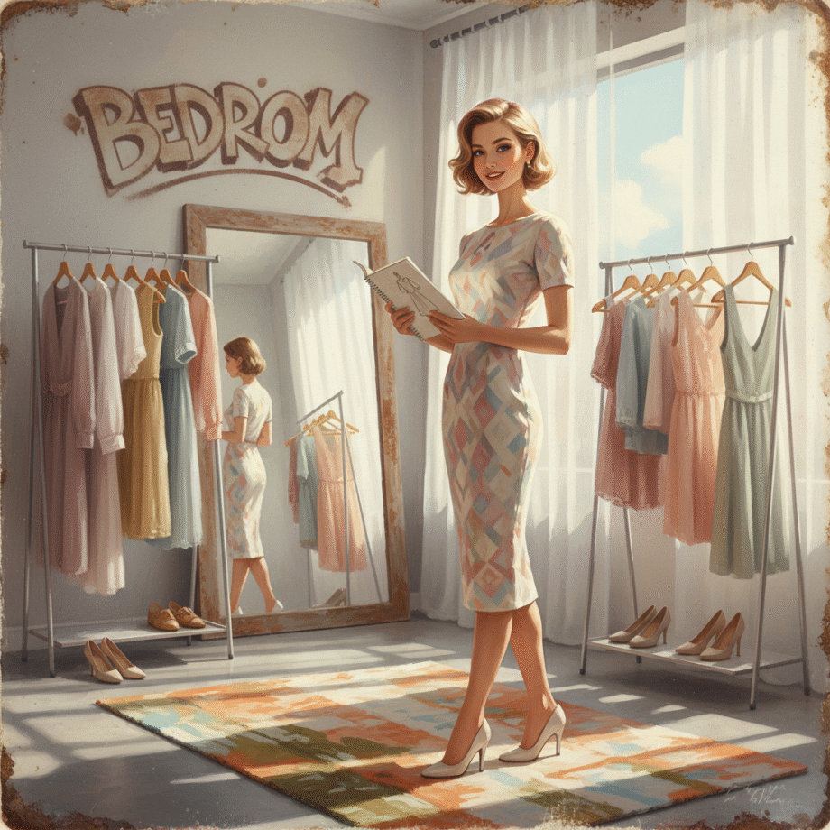 Retro-inspired vibrant oil painting and aerosol graph highly detailed digital image with soft vintage-effect. Scene: of a young, attractive woman with Slavic features and light hair, wearing a pastel-colored, fashionable dress, standing in a bright, stylish room. She is smiling confidently at the camera and holding a notebook, symbolizing a lifestyle and fashion advice blogger. The room features a large mirror and clothing racks filled with various outfits, maintaining a clutter-free and positive atmosphere. Soft, natural lighting enhances the scene, and the background includes a large window with sheer curtains, adding to the airy feel without distracting from the main subject. The overall composition is focused and serene, suitable for all audiences. IMAGE STYLE: The artwork has a retro color palette with warm orange, earthy green and sky blue, featuring rusted edges for an aged look. The text reads: 'Bedroom’ The overall style mimics classic mid-century advertising with a humorous twist