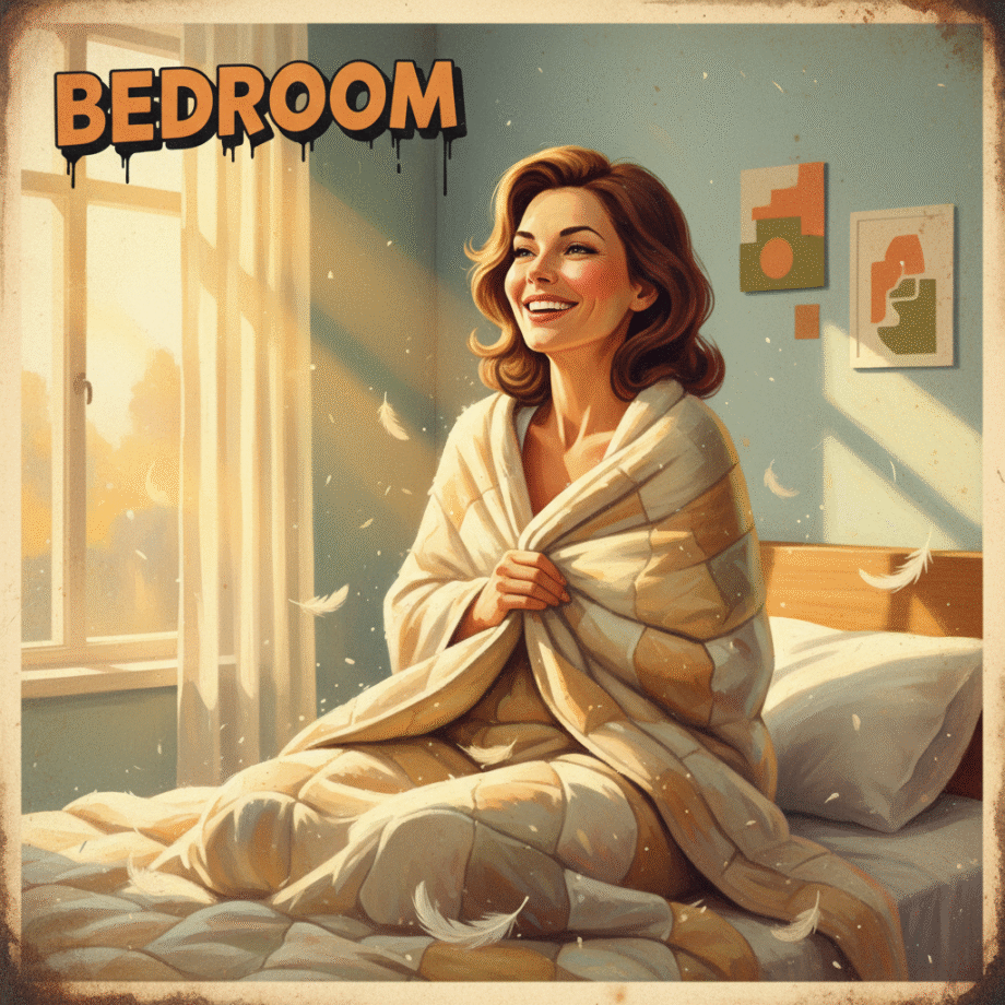 Retro-inspired vibrant oil painting and aerosol graph highly detailed digital image with soft vintage-effect. Scene: of a smiling woman in her mid-30s with Slavic features, chestnut hair, and fair skin, waking up in a cozy bedroom. She is wrapped in a soft, light blanket with neutral, warm colors. Morning sunlight streams through a nearby window, highlighting her radiant smile and smooth skin. Subtle elements like feathers and wool are gently placed on the bed, blending with modern synthetic fabrics, creating a harmonious composition of relaxation and comfort. The room features light, soothing tones and minimal decor to maintain focus on the woman. The overall mood is serene and inviting, suitable for all audiences. IMAGE STYLE: The artwork has a retro color palette with warm orange, earthy green and sky blue, featuring rusted edges for an aged look. The text reads: 'Bedroom’ The overall style mimics classic mid-century advertising with a humorous twist