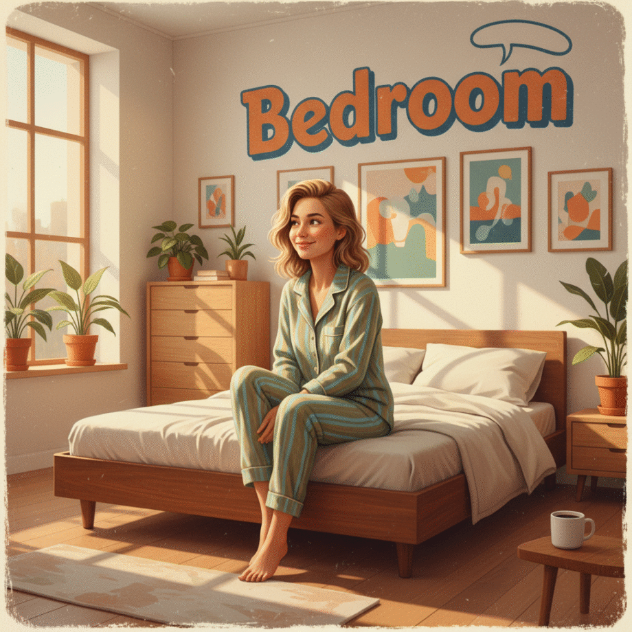 Retro-inspired vibrant oil painting and aerosol graph highly detailed digital image with soft vintage-effect. Scene: of a young woman in her early 30s with light blonde hair and delicate Slavic features, smiling as she wakes up in a cozy Scandinavian-style bedroom. She is sitting on the edge of a simple, dark wooden bed, surrounded by warm wooden furniture, white walls, and green plants. Soft morning light filters through a window, creating a warm and relaxing atmosphere. A cup of coffee sits on the nightstand beside the bed. The room is light and airy, with no distracting elements, focusing on the woman and the serene environment. The overall composition is intimate and inviting, suitable for all audiences. IMAGE STYLE: The artwork has a retro color palette with warm orange, earthy green and sky blue, featuring rusted edges for an aged look. The text reads: 'Bedroom’ The overall style mimics classic mid-century advertising with a humorous twist
