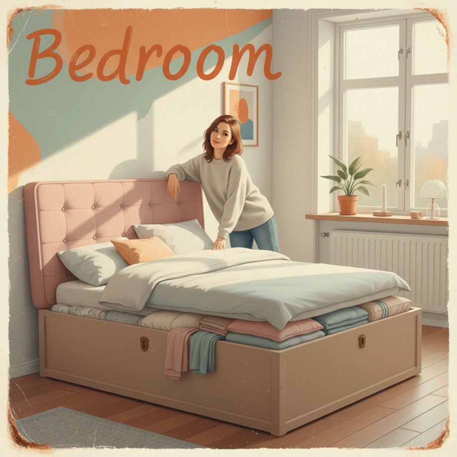 Retro-inspired vibrant oil painting and aerosol graph highly detailed digital image with soft vintage-effect. Scene: of a Scandinavian-style bedroom with a woman in her thirties, featuring a solid wooden trunk with a neutral beige color as the central element. The trunk has its lid open, revealing neatly organized bedding, pillows, and folded clothes. On the trunk lies a soft mattress with pastel-colored bedding. The woman, with a Slavic appearance and a playful smile, has a cascade of chestnut hair, light makeup, and is wearing a loose, comfortable sweater and jeans. She is leaning against a pink upholstered headboard. The room is light and minimalist, with natural light entering through a window, creating a warm and inviting atmosphere. The background includes subtle elements like a small potted plant and a piece of modern art on the wall, ensuring the focus remains on the woman and the trunk. IMAGE STYLE: The artwork has a retro color palette with warm orange, earthy green and sky blue, featuring rusted edges for an aged look. The text reads: 'Bedroom’ The overall style mimics classic mid-century advertising with a humorous twist