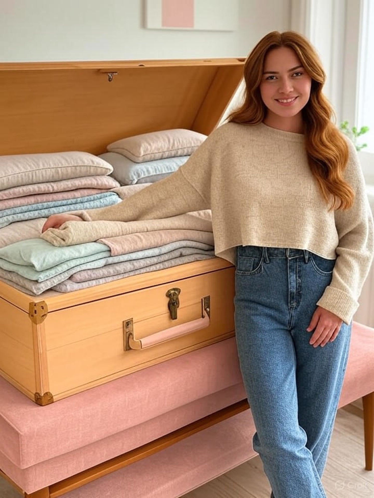 Elegancka sypialnia w stylu skandynawskim z łóżkiem trunk jako centralnym elementem: solidna drewniana skrzynia w neutralnym beżowym odcieniu z podniesioną klapą, odsłaniającą przestronny, uporządkowany schowek z równo ułożoną pościelą, poduszkami i składanymi ubraniami. Na łóżku leży miękki materac z neutralną pościelą w pastelowych kolorach. W tle stoi smukła kobieta po trzydziestce o słowiańskiej urodzie – Polka z burzą kasztanowych włosów, delikatnym makijażem i figlarnym uśmiechem, ubrana w luźny, wygodny sweter i jeansy, oparta o tapicerowany zagłówek w pudrowym różu. Pokój jest jasny, minimalistyczny, z naturalnym światłem z okna, podkreślającym harmonię i komfort. Realistyczna ilustracja, bezpieczna dla wszystkich, w ciepłych, przytulnych tonach.