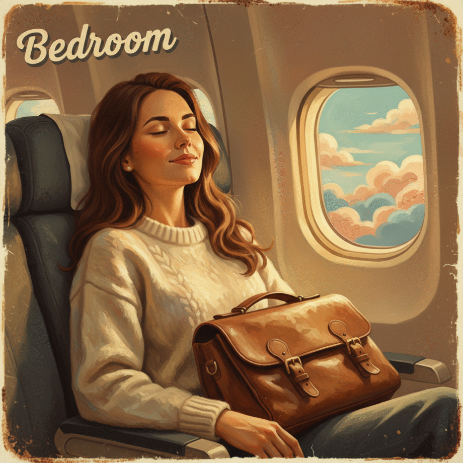 Retro-inspired vibrant oil painting and aerosol graph highly detailed digital image with soft vintage-effect. Scene: of a young Slavic woman in her mid-30s with chestnut brown hair and delicate facial features, relaxing in an airplane seat. She has a peaceful smile and her eyes are closed, appearing refreshed and radiant. She is wearing a cozy sweater and has a stylish travel bag on her lap. Behind her, through the airplane window, clouds are visible, adding depth to the scene. The cabin lighting is soft, contributing to a warm, relaxing atmosphere. The background is subtly detailed to not distract from the main subject, ensuring the focus remains on her calm expression. The overall composition is cozy and inviting, with no explicit nudity or harsh elements, making it safe for all audiences. IMAGE STYLE: The artwork has a retro color palette with warm orange, earthy green and sky blue, featuring rusted edges for an aged look. The text reads: 'Bedroom’ The overall style mimics classic mid-century advertising with a humorous twist