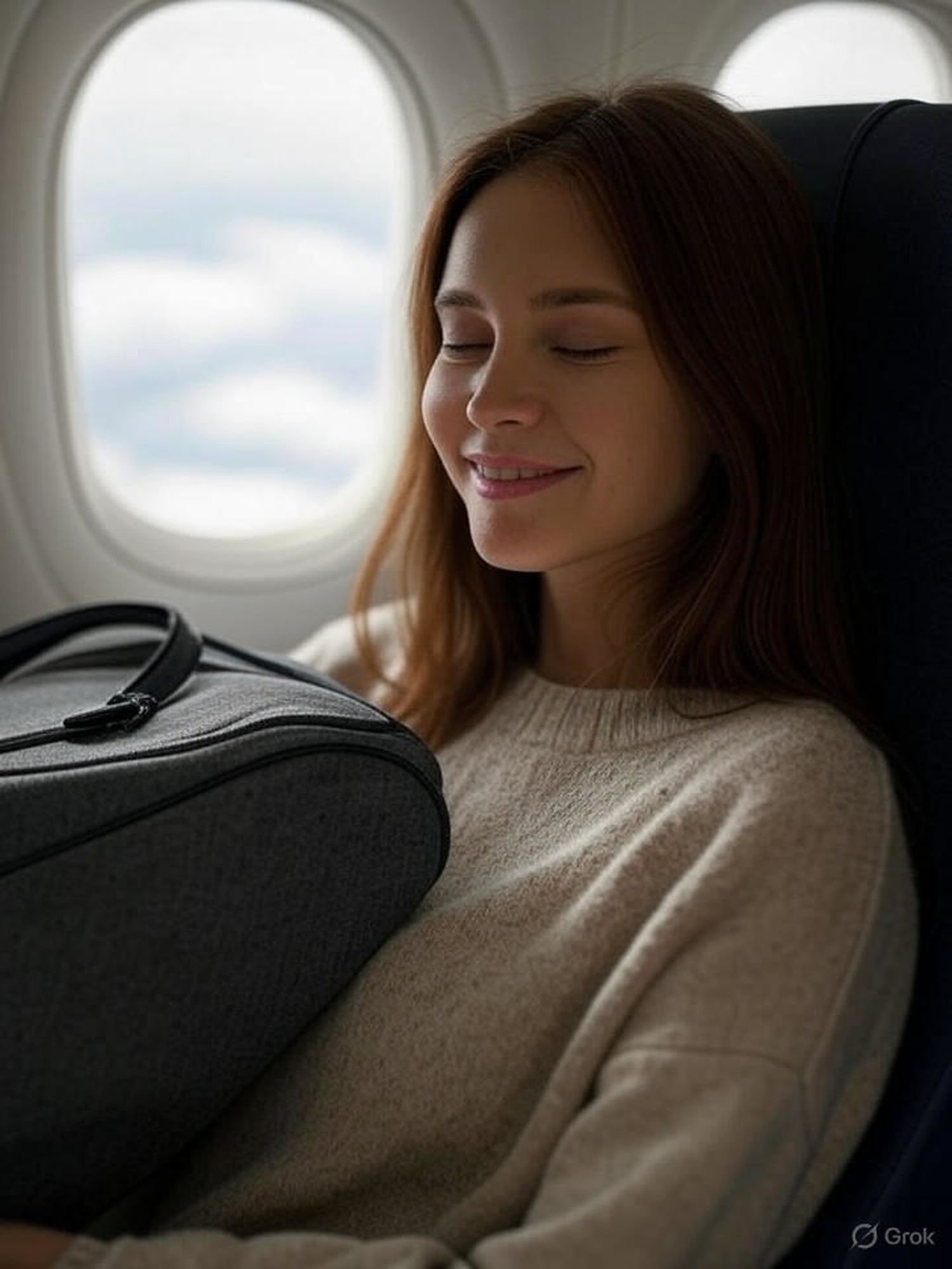 Młoda kobieta o słowiańskiej urodzie, około 35 lat, z kasztanowymi włosami i delikatnymi rysami twarzy, relaksująca się w samolocie podczas lotu. Siedzi wygodnie w fotelu, opierając głowę na ergonomicznej poduszce podróżnej w kształcie litery U w subtelnym beżowym kolorze, z zamkniętymi oczami i spokojnym uśmiechem na twarzy, wyglądając na wypoczętą i promienną. W tle widoczne okno samolotu z chmurami, a na kolanach ma stylową torbę podróżną. Ilustracja w ciepłych, relaksujących tonach, realistyczna, bezpieczna dla wszystkich odbiorców.