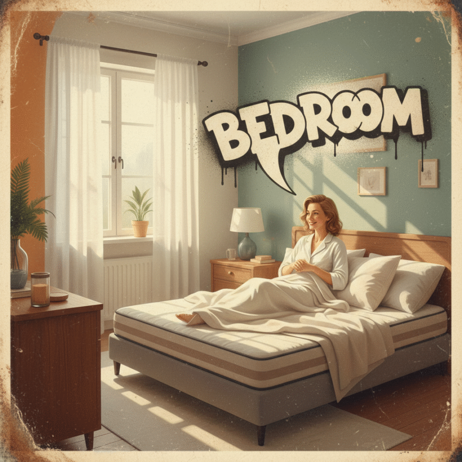 Retro-inspired vibrant oil painting and aerosol graph highly detailed digital image with soft vintage-effect. Scene: of a smiling woman in her mid-30s with light hair and delicate Slavic features, waking up in a cozy, well-lit bedroom. She is lying on a comfortable, modern mattress with a neutral beige and white cover, surrounded by soft pillows and a light blanket. The room features wooden furniture and morning light filtering through a window with white curtains, creating a warm and relaxing atmosphere. The decor is minimalist with natural tones, emphasizing comfort and good sleep. The scene avoids any explicit content, focusing on a peaceful and inviting bedroom setting. IMAGE STYLE: The artwork has a retro color palette with warm orange, earthy green and sky blue, featuring rusted edges for an aged look. The text reads: 'Bedroom’ The overall style mimics classic mid-century advertising with a humorous twist