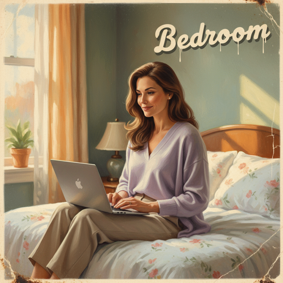 Retro-inspired vibrant oil painting and aerosol graph highly detailed digital image with soft vintage-effect. Scene: of a woman in her mid-30s with Slavic features and a cascade of chestnut brown hair, sitting comfortably on a bed in a cozy bedroom. She is dressed in a stylish loungewear set, including a pastel lavender oversized V-neck modal blouse, neutral beige palazzo pants, and a soft cashmere cardigan. She has a subtle, confident smile and is working on a laptop placed on her lap. The bedroom features white bedding with delicate floral patterns and natural morning light filtering through a nearby window, creating an atmosphere of comfort and elegance. The background is softly blurred to focus on the woman, maintaining a realistic and inviting setting. IMAGE STYLE: The artwork has a retro color palette with warm orange, earthy green and sky blue, featuring rusted edges for an aged look. The text reads: 'Bedroom’ The overall style mimics classic mid-century advertising with a humorous twist