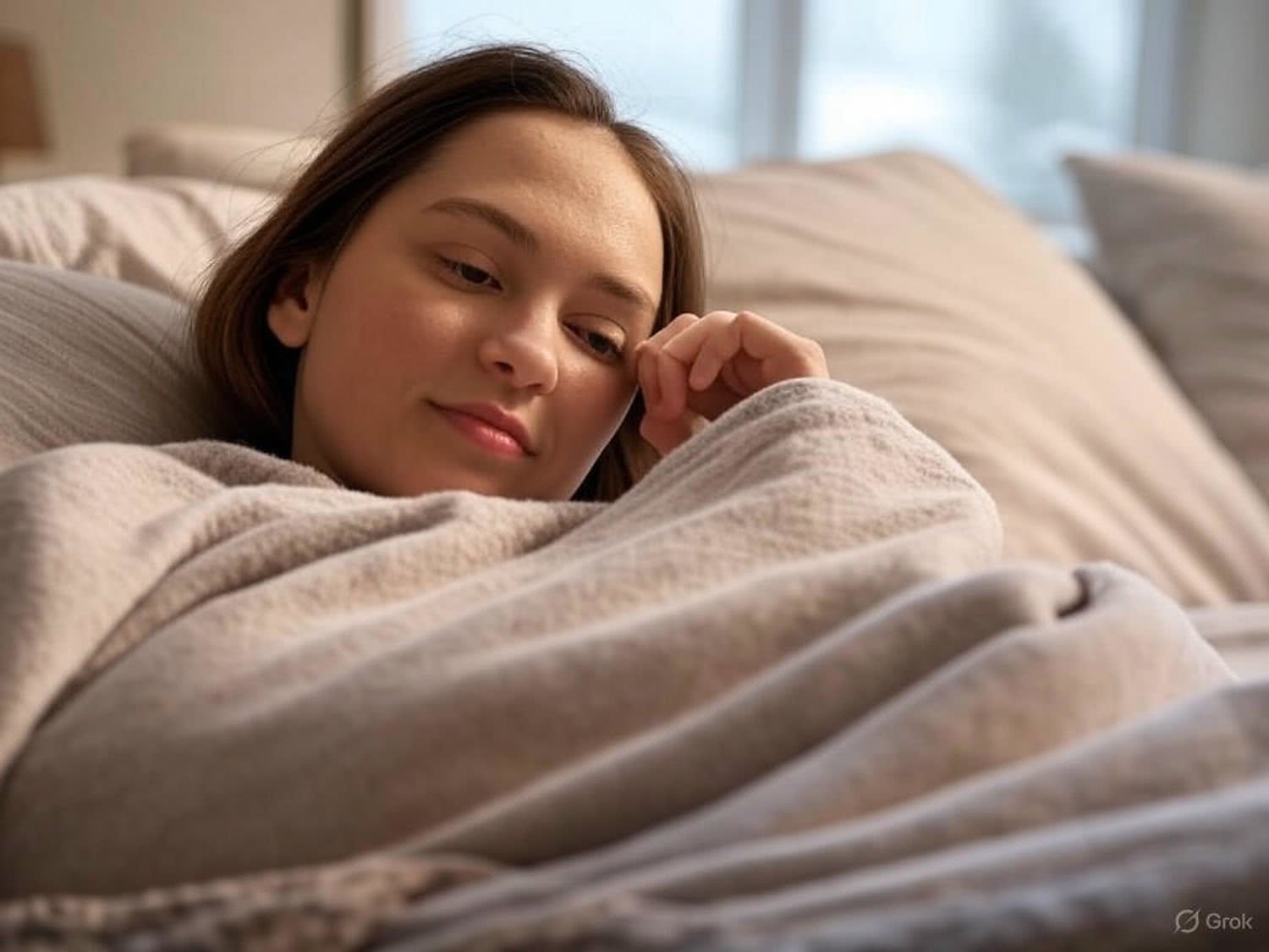Retro-inspired vibrant oil painting and aerosol graph highly detailed digital image with soft vintage-effect. SCENE: of a young woman in her late 30s with Slavic features, light skin, and brown hair, lying in a cozy bedroom. She is covered with a soft flannel bedsheet in a muted beige color, looking relaxed. The room is softly lit, possibly by natural light from a window showing a snowy outdoor scene. The decor is warm and inviting, with neutral tones and possibly a wooden bedside table with a lamp. The overall atmosphere is calm and familial, with no distracting elements, focusing on the woman’s peaceful expression and the serene environment. IMAGE STYLE: The artwork has a retro color palette with warm orange, earthy green and sky blue, featuring rusted edges for an aged look. The text reads: 'Bedroom’ The overall style mimics classic mid-century advertising with a humorous twist