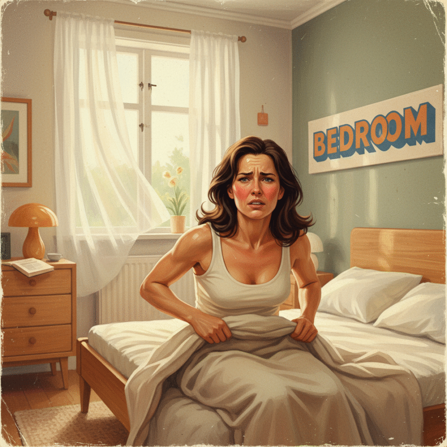 Retro-inspired vibrant oil painting and aerosol graph highly detailed digital image with soft vintage-effect. Scene: of a woman in her mid-30s with a Slavic appearance and athletic build, lying in a light, airy Scandinavian-style bedroom. She has dark brown hair and is wearing light-colored sleepwear, showing signs of discomfort and frustration due to the heat, with beads of sweat on her forehead and flushed cheeks. She is partially uncovering a light-colored duvet in an attempt to cool down. The background features a sunlit window with sheer curtains, and a bedside table with a book and a lamp, maintaining a slightly messy but cozy atmosphere. The room is decorated in warm, neutral tones, with wooden furniture and white bedding, emphasizing the practical challenges of sleeping in warm conditions. The focus is primarily on the woman’s face and upper body, with the background elements subtly supporting the main subject without distraction. IMAGE STYLE: The artwork has a retro color palette with warm orange, earthy green and sky blue, featuring rusted edges for an aged look. The text reads: 'Bedroom’ The overall style mimics classic mid-century advertising with a humorous twist