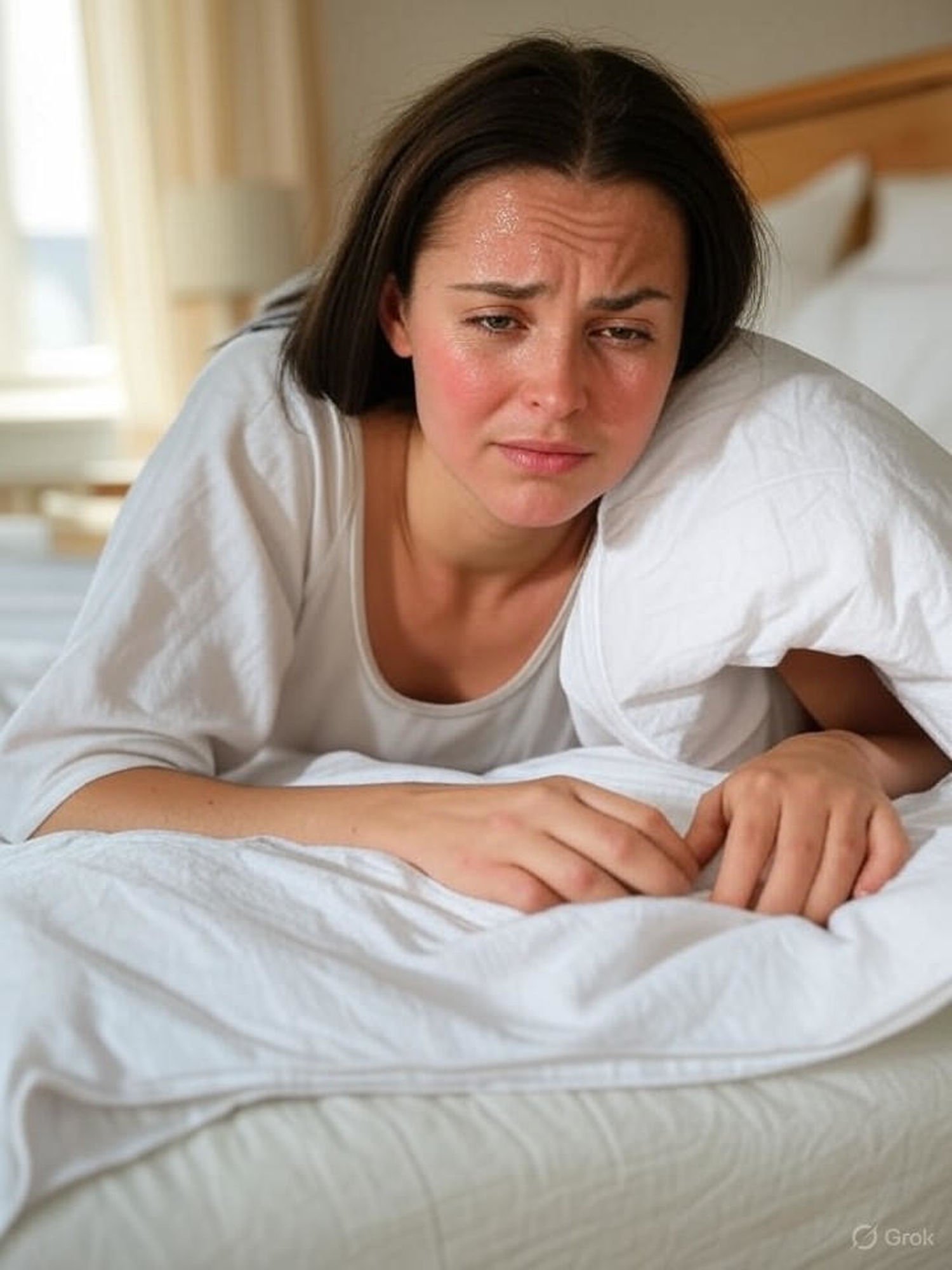 Kobieta o słowiańskiej urodzie, około 35-40 lat, brunetka z atletyczną sylwetką, leżąca w łóżku z materacem termoelastycznym w przytulnej, jasnej sypialni w stylu skandynawskim. Wyraz twarzy pokazuje dyskomfort i frustrację z powodu ciepła – krople potu na czole, rumieńce, odsłania kołdrę, próbując się ochłodzić. W tle okno z letnim słońcem, lekki bałagan na stoliku nocnym z książką i lampką. Ilustracja realistyczna, bezpieczna dla wszystkich, w ciepłych tonach, podkreślająca praktyczne wyzwania snu.