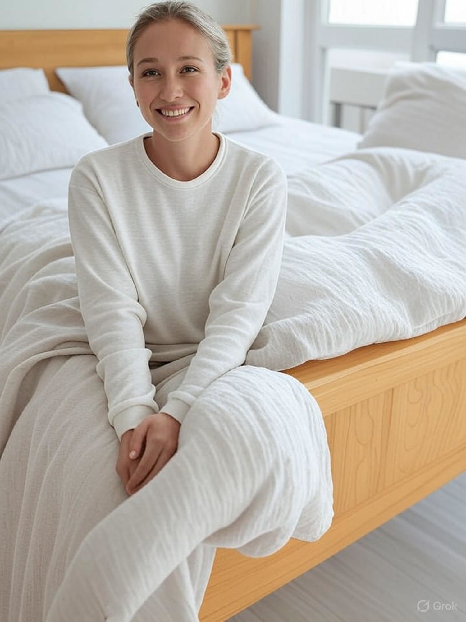 Kobieta o słowiańskiej urodzie, około 35 lat, o jasnych włosach i delikatnych rysach twarzy, budzi się wypoczęta i uśmiechnięta w jasnej, przytulnej sypialni w stylu skandynawskim. Siedzi na brzegu prostego drewnianego łóżka z gładkimi słojami sosny, otoczona czystą pościelą z bawełny organicznej w neutralnych beżowych tonach. W tle delikatnie widoczne jest eleganckie tapicerowane łóżko w szarym kolorze z zdejmowalną tkaniną hipoalergiczną, stojące obok jak alternatywa. Pokój jest jasny, z naturalnym światłem z okna, bez kurzu, symbolizując higienę i komfort dla alergików; ilustracja w stylu realistycznym, ciepłe kolory, atmosfera relaksu i świeżości.