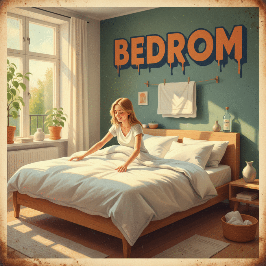 Retro-inspired vibrant oil painting and aerosol graph highly detailed digital image with soft vintage-effect. Scene: of a young woman with light hair and Slavic features, smiling and relaxed in a Scandinavian-style bedroom. She is spreading a freshly laundered, fluffy white duvet on a bed surrounded by clean pillows, with morning light softly illuminating the scene through a window showing a green balcony. The background includes a subtle clothesline with the duvet and a bottle of vinegar, maintaining an atmosphere of cleanliness and comfort. The room features light, warm tones and minimalistic decor, ensuring a safe and inviting environment for all audiences. IMAGE STYLE: The artwork has a retro color palette with warm orange, earthy green and sky blue, featuring rusted edges for an aged look. The text reads: 'Bedroom’ The overall style mimics classic mid-century advertising with a humorous twist