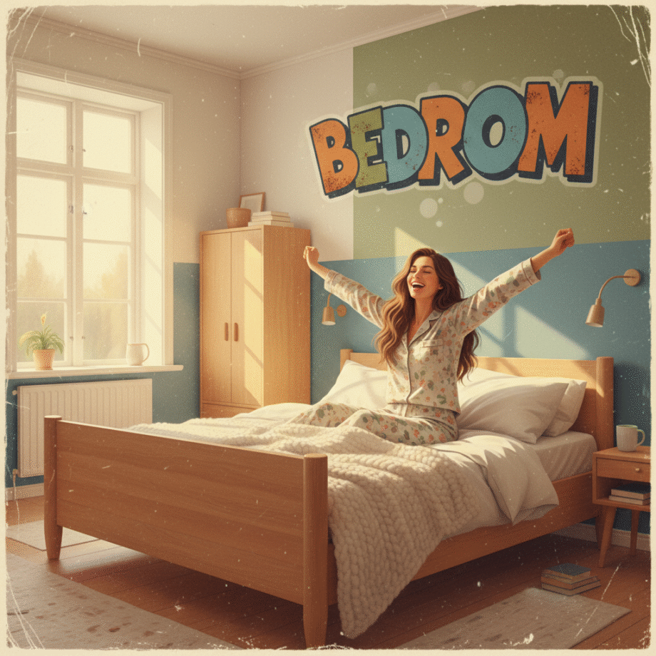 Retro-inspired vibrant oil painting and aerosol graph highly detailed digital image with soft vintage-effect. Scene: of a woman in her early 30s with a playful smile, waking up in a light, cozy Scandinavian-style bedroom. She has long, wavy chestnut hair and is wearing a loose, comfortable pajama set, lying on a plush bed with a solid wooden frame and soft pillows. Natural light filters through a large window, illuminating the scene with a warm, soft glow. The room features minimalistic decor with wooden furniture and pastel-colored walls, creating a serene and inviting atmosphere. The focus is on her face and upper body, capturing her expression of energy and relaxation. The overall composition emphasizes comfort and tranquility, suitable for all audiences. IMAGE STYLE: The artwork has a retro color palette with warm orange, earthy green and sky blue, featuring rusted edges for an aged look. The text reads: 'Bedroom’ The overall style mimics classic mid-century advertising with a humorous twist