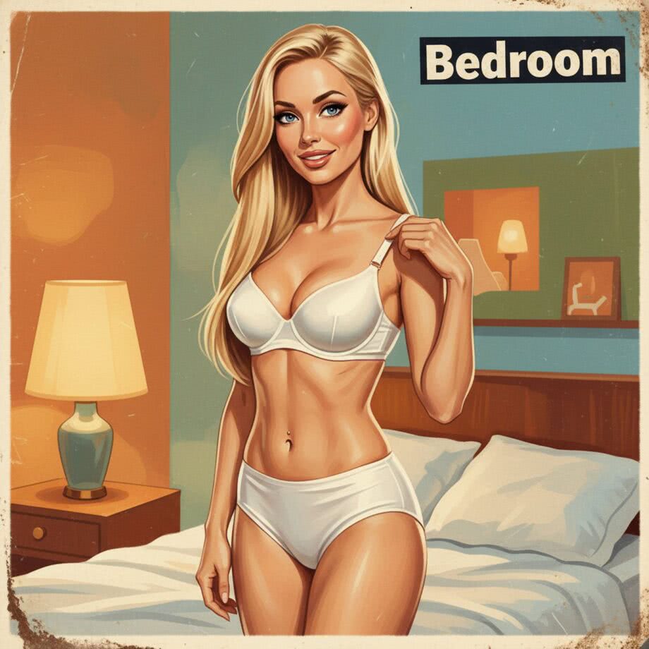 Retro-inspired vibrant oil painting and aerosol graph highly detailed digital image with soft vintage-effect. Scene: A professional illustration of a confident Swedish woman in her early thirties, embodying elegant sensuality in a cozy bedroom illuminated by soft, warm lamplight. She has long, straight blonde hair cascading freely over her shoulders and back, piercing blue eyes with a warm, inviting gaze, smooth lightly tanned skin, a slender figure with a defined waist, flat stomach featuring a small shiny navel piercing, delicate facial features, and full lips lightly glossed in pale pink. She wears a classic white satin lingerie set: a smooth, supportive bra that gently lifts her bust creating a natural décolleté, and high-waisted panties that hug her hips and waist, the glossy satin fabric subtly reflecting light and shadows to accentuate her graceful curves without overt exposure. She stands poised near a bed with rumpled sheets, one hand lightly adjusting a slipped strap, a playful smile on her lips, evoking subtle seduction and authentic allure in an intimate, serene atmosphere. IMAGE STYLE: The artwork has a retro color palette with warm orange, earthy green and sky blue, featuring rusted edges for an aged look. The text reads: 'Bedroom’ The overall style mimics classic mid-century advertising with a humorous twist