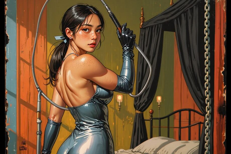 Retro-inspired vibrant oil painting and aerosol graph highly detailed digital image with soft vintage-effect. Scene: A professional digital illustration of a confident 35-year-old Thai woman named Lana, embodying dominant sensuality in a dimly lit bedroom. She has a petite, athletic build with warm olive skin dotted with subtle freckles on her shoulders, dark straight shoulder-length hair tied in a loose ponytail with a simple ribbon, dark expressive eyes sparkling with playful intelligence, and a small eyebrow piercing adding an edgy touch. She wears a shiny metallic silver latex catsuit that hugs her figure like a second skin, with an open back revealing her smooth shoulders and back, paired with long black latex gloves reaching her elbows. In her right hand, she holds a sleek silver whip with a metallic handle, standing poised and authoritative near a black four-poster bed draped in heavy velvet black canopy curtains. Silver decorative chains with soft padding hang from the ceiling and walls, reflecting soft ambient light from flickering candles, creating an intimate, luxurious BDSM-inspired atmosphere of power and fantasy. The style is realistic yet artistic, with dramatic lighting highlighting the contrast between the cool silver tones and her warm skin, evoking empowerment and allure. IMAGE STYLE: The artwork has a retro color palette with warm orange, earthy green and sky blue, featuring rusted edges for an aged look. The text reads: 'Bedroom’ The overall style mimics classic mid-century advertising with a humorous twist