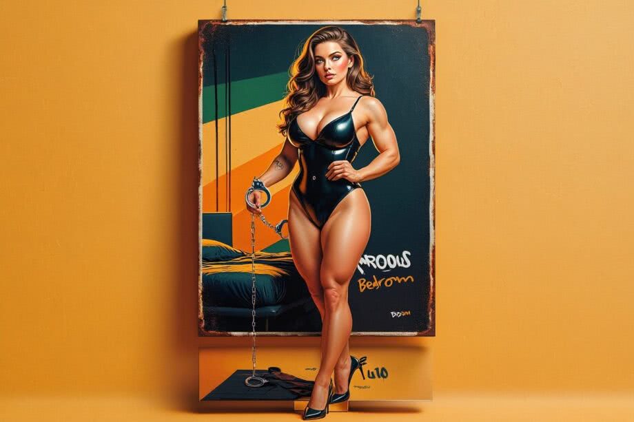 Retro-inspired vibrant oil painting and aerosol graph highly detailed digital image with soft vintage-effect. Scene: A professional illustration of a confident, athletic woman in her mid-30s with Slavic features—fair skin with a subtle tan, sharp facial contours, large expressive eyes accentuated by light smoky shadow, narrow lips, and long wavy light-brown hair cascading freely—standing dominantly in a dimly lit minimalist bedroom. She wears a sleek black vinyl bodysuit with strategic cutouts exposing her toned abs and muscular arms, hips, and thighs, paired with high-heeled shoes and holding stylish silver handcuffs with a chain. The room features black floor mats and subtle silver ceiling hooks, evoking an intimate, empowering BDSM atmosphere with soft shadows and a sensual, playful energy. IMAGE STYLE: The artwork has a retro color palette with warm orange, earthy green and sky blue, featuring rusted edges for an aged look. The text reads: 'Bedroom’ The overall style mimics classic mid-century advertising with a humorous twist