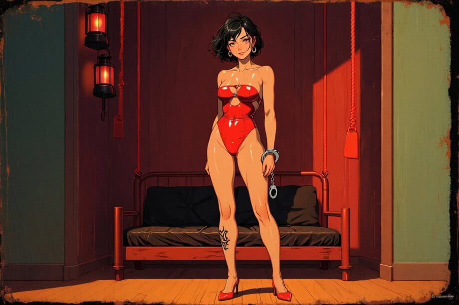 Retro-inspired vibrant oil painting and aerosol graph highly detailed digital image with soft vintage-effect. Scene: A sensual professional illustration of a confident 35-year-old woman embodying a fiery dominatrix in a dimly lit bedroom. She has short, tousled black hair framing her face with prominent cheekbones, a square jaw, large light-brown eyes sparkling with intensity, and sun-kissed tanned skin. Her figure features a slender neck, ample bust, defined waist, long slim legs, and a tribal tattoo on her calf. She wears a glossy red vinyl bodysuit with strategic cutouts at the hips and décolletage, accentuating her curves; silver handcuffs dangle lightly from her wrist; and red high-heeled stilettos. She stands dominantly near a black leather bench with adjustable restraints, red velvet ropes hanging from the bedframe, against burgundy walls illuminated by soft red lantern light, evoking passion and trust in an intimate BDSM atmosphere. Render in a realistic digital art style with warm tones, dramatic shadows, and empowering poise. IMAGE STYLE: The artwork has a retro color palette with warm orange, earthy green and sky blue, featuring rusted edges for an aged look. The text reads: 'Bedroom’ The overall style mimics classic mid-century advertising with a humorous twist