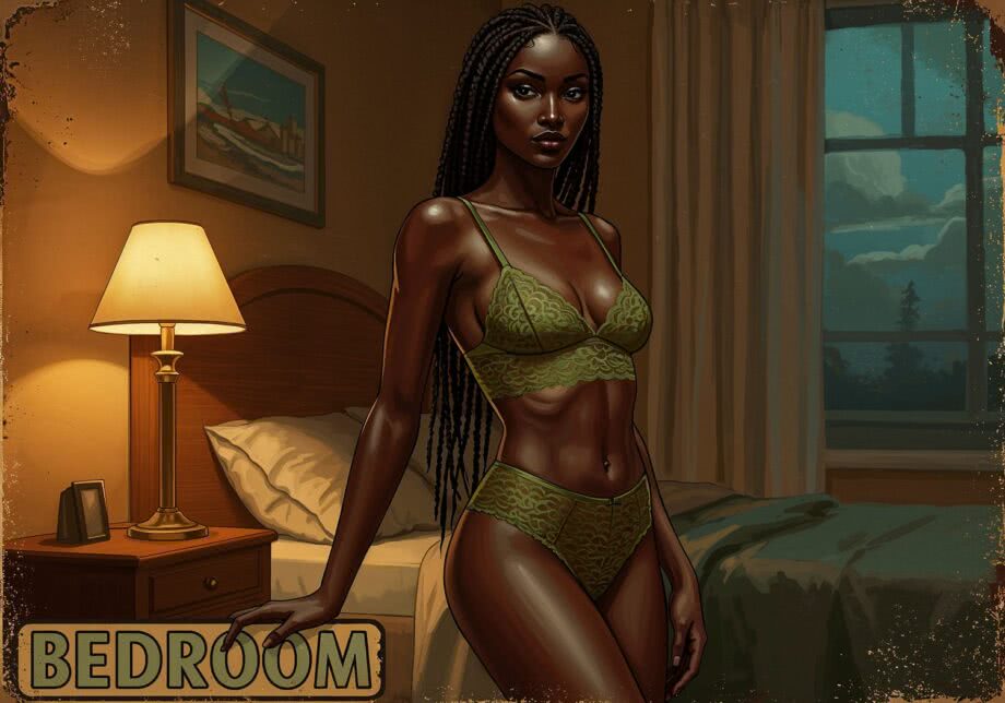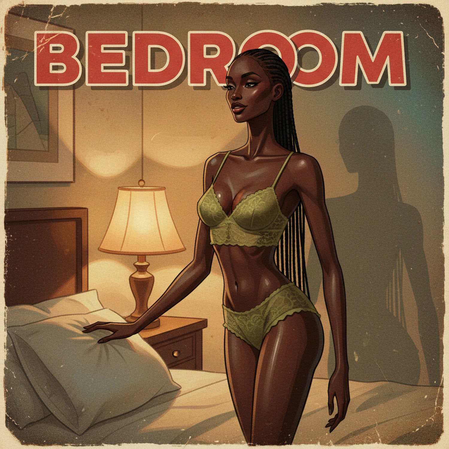 Retro-inspired vibrant oil painting and aerosol graph highly detailed digital image with soft vintage-effect. Scene: A professional digital illustration of a confident Sudanese woman named Aisha in a dimly lit bedroom at evening, with soft lamp light casting gentle shadows on the walls. She has very dark, glossy ebony skin, a long slender neck with prominent collarbones, high cheekbones, and a poised, elongated face exuding calm strength. Her long black hair is intricately braided into thin cornrows cascading down her back. She possesses a very slim, graceful figure: narrow waist with visible ribs, slim arms and long legs, contrasting with a full, rounded bust. She wears an elegant olive green lace lingerie set – a delicate top with thin straps that subtly lifts and accentuates her bust, featuring sheer lace patterns revealing hints of skin on her ribs and waist; paired with high-waisted olive green lace panties that hug her hips and emphasize her long legs, with soft ruffles at the edges. She stands or poses gracefully near the bed, embodying subtle seduction and natural poise, with a hint of a knowing smile, in a warm, intimate atmosphere that highlights the interplay of light and shadow on her skin and the lace textures. IMAGE STYLE: The artwork has a retro color palette with warm orange, earthy green and sky blue, featuring rusted edges for an aged look. The text reads: 'Bedroom’ The overall style mimics classic mid-century advertising with a humorous twist