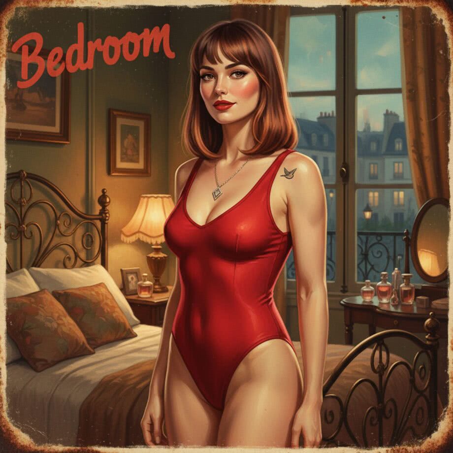 Retro-inspired vibrant oil painting and aerosol graph highly detailed digital image with soft vintage-effect. Scene: A sensual illustration of a confident 30-year-old woman with Slavic features—fair skin with a subtle blush, shoulder-length straight chestnut hair with red highlights and a playful French fringe falling over her forehead, intelligent brown eyes, and full lips painted in bold red lipstick—standing in an intimate Parisian bedroom at evening. She wears a form-fitting scarlet red bodysuit with strategic cutouts exposing her delicate collarbones and subtle hip bones, the soft elastic fabric hugging her slender, gently curved figure. A small bird tattoo is visible on her shoulder, and a silver chain necklace with a diamond-shaped pendant rests in her cleavage. Warm lamplight casts soft shadows on her skin, highlighting her poised, liberated pose as she gazes mysteriously at the viewer, evoking subtle eroticism and self-assured sensuality. Professional digital art style, elegant and suggestive without explicitness. IMAGE STYLE: The artwork has a retro color palette with warm orange, earthy green and sky blue, featuring rusted edges for an aged look. The text reads: 'Bedroom’ The overall style mimics classic mid-century advertising with a humorous twist