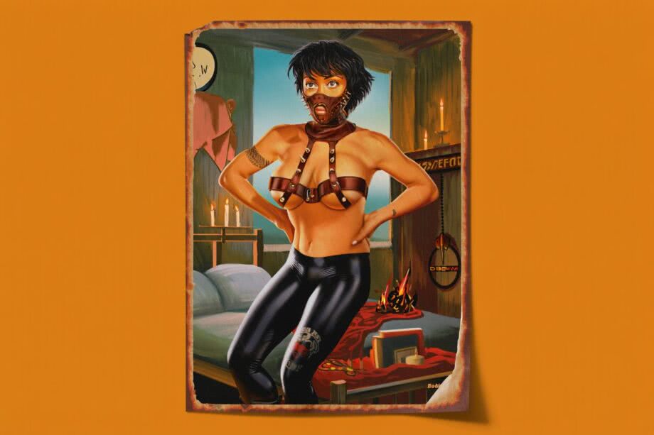 Retro-inspired vibrant oil painting and aerosol graph highly detailed digital image with soft vintage-effect. Scene: A professional illustration of a confident 35-year-old woman of Eastern European Slavic descent, resembling a Polish beauty with short, tousled black hair reaching her ears, prominent cheekbones, square jawline, large bust, slender neck, defined waist creating an hourglass figure, lightly tanned skin, and a tribal tattoo on her slim calf. She stands dominantly in a dimly lit bedroom with warm flickering light from brown candles casting shadows on wooden walls and a rustic wooden BDSM cross in the corner. She wears a brown leather harness with sharp spikes accentuating her bust and jaw, black shiny latex leggings hugging her long legs and highlighting the tattoo, and a brown leather mask covering the upper face, intensifying her large light-brown hypnotic eyes. Her pose is powerful and seductive, exuding primal dominance and allure, with an earthy, adventurous vibe blending comfort and bold BDSM expression. IMAGE STYLE: The artwork has a retro color palette with warm orange, earthy green and sky blue, featuring rusted edges for an aged look. The text reads: 'Bedroom’ The overall style mimics classic mid-century advertising with a humorous twist