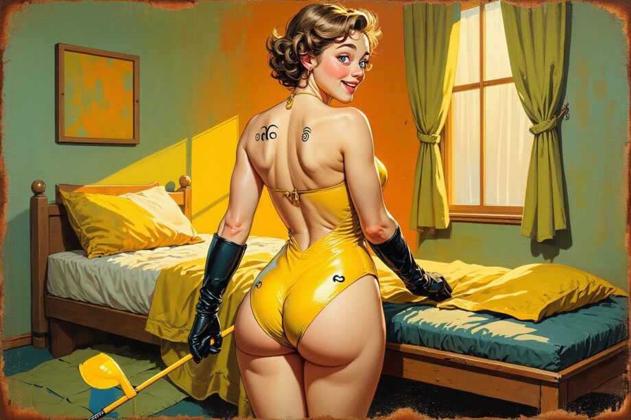 Retro-inspired vibrant oil painting and aerosol graph highly detailed digital image with soft vintage-effect. Scene: A professional illustration of a confident, joyful dominatrix woman with Slavic features—fair skin, short curly blonde hair, large sparkling blue eyes, full lips curved in a playful smile, and an athletic, slender build with subtle abdominal muscles and prominent hip bones—standing in a warmly lit bedroom. She wears a shiny yellow latex bodysuit with open back revealing small wave and strength symbol tattoos on her stomach and hips, paired with black elbow-length gloves. In her hand, she holds a yellow riding crop lightly. The room features yellow accents on walls, bedding, pillows, and curtains, contrasting with a sturdy black leather spanking bench in the foreground, evoking an energetic, teasing BDSM atmosphere filled with warmth and humor. IMAGE STYLE: The artwork has a retro color palette with warm orange, earthy green and sky blue, featuring rusted edges for an aged look. The text reads: 'Bedroom’ The overall style mimics classic mid-century advertising with a humorous twist