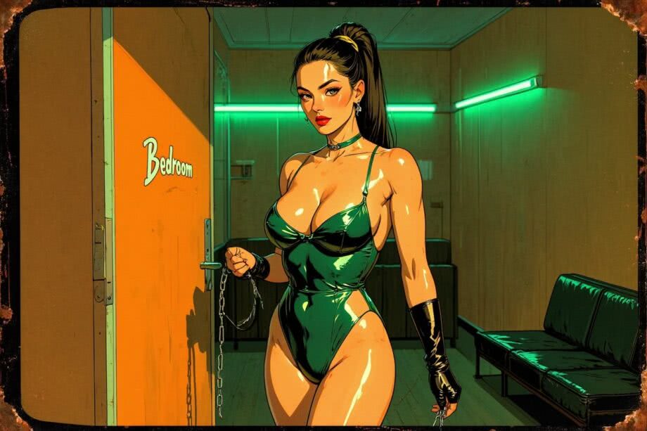 Retro-inspired vibrant oil painting and aerosol graph highly detailed digital image with soft vintage-effect. Scene: A professional digital illustration of a confident, dominant woman in her mid-30s with Slavic features: high cheekbones, fair skin, long dark hair tied in a sleek high ponytail cascading down her back, full red lips, almond-shaped eyes with smoky makeup, and subtle dangling earrings. She has a curvaceous yet athletic figure with full breasts, slim waist, narrow hips, and slender thighs. She stands powerfully in an intimate bedroom scene, wearing a shiny emerald green latex bodysuit with strategic cutouts at the hips, black open-finger gloves, and holding a sleek whip with a chain in one hand. The room is dimly lit with glowing emerald green neon lights casting dramatic reflections on her outfit, a black leather bench in the corner, and subtle erotic tension in the air. Render in a sensual, empowering style with high detail, vibrant colors, and a focus on her hypnotic gaze and poised stance. IMAGE STYLE: The artwork has a retro color palette with warm orange, earthy green and sky blue, featuring rusted edges for an aged look. The text reads: 'Bedroom’ The overall style mimics classic mid-century advertising with a humorous twist