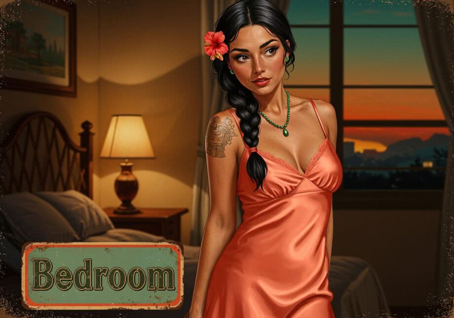 Retro-inspired vibrant oil painting and aerosol graph highly detailed digital image with soft vintage-effect. Scene: A sensual illustration of a 35-year-old woman named Sofia, with long black hair loosely braided in a single plait adorned with vibrant hibiscus flowers, deep brown eyes sparkling with playful allure, olive skin dotted with freckles on her cheeks, and an hourglass figure emphasizing curvaceous hips. She wears a classic coral satin nightgown with delicate spaghetti straps that reveal a tattoo of the Aztec Quetzalcoatl serpent on her shoulder, the smooth fabric gently draping and subtly accentuating her waist and hips, ending just above the knees in a soft, flowing hem. A green jade necklace rests against her décolletage. She stands gracefully in a dimly lit bedroom at dusk, with warm lamplight casting a soft glow on the satin, highlighting the material’s sheen and her natural poise, evoking subtle eroticism and confidence, in a realistic yet elegant style with warm tones inspired by Mexican sunsets. IMAGE STYLE: The artwork has a retro color palette with warm orange, earthy green and sky blue, featuring rusted edges for an aged look. The text reads: 'Bedroom’ The overall style mimics classic mid-century advertising with a humorous twist