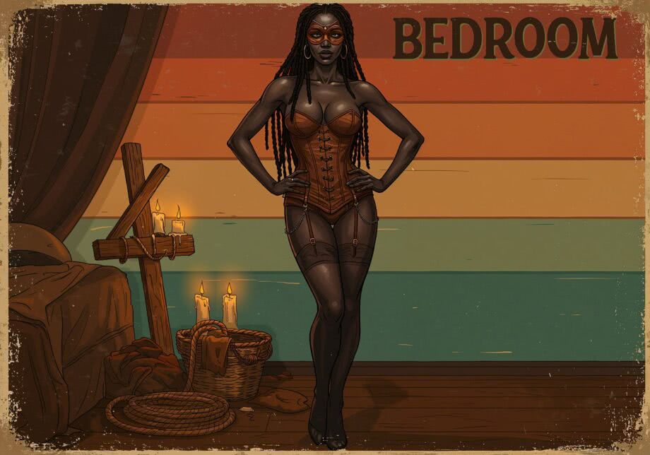Retro-inspired vibrant oil painting and aerosol graph highly detailed digital image with soft vintage-effect. Scene: A professional digital illustration of a confident dominant woman in her thirties, embodying sensual power in a dimly lit bedroom. She has very dark obsidian-like skin, long black hair in thin intricate braids cascading over her slender shoulders, a long elegant neck, prominent collarbones, angular face with high cheekbones, slim arms and legs contrasting with a full bust and visible ribs for a delicate yet commanding silhouette. She wears a form-fitting brown leather corset-dress with dangling delicate chains, black stockings hugging her legs, and a brown mask covering her eyes, creating an aura of mystery. She stands assertively near a rustic wooden St. Andrew’s cross and coiled brown shibari ropes on the floor, the room warmed by candlelight and earthy tones evoking a savanna-inspired intimacy, her expression poised and alluring. IMAGE STYLE: The artwork has a retro color palette with warm orange, earthy green and sky blue, featuring rusted edges for an aged look. The text reads: 'Bedroom’ The overall style mimics classic mid-century advertising with a humorous twist