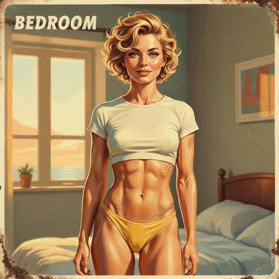Retro-inspired vibrant oil painting and aerosol graph highly detailed digital image with soft vintage-effect. Scene: A professional illustration of a confident 35-year-old woman with Slavic Eastern European beauty—short curly blonde hair with a sun-kissed glow, bright blue eyes sparkling with joy, full lips in an optimistic smile, smooth lightly tanned skin, athletic slender build featuring visible abdominal muscles, flat chest, and prominent hip bones adorned with subtle tattoos of delicate waves and freedom symbols on her stomach and hips. She stands provocatively yet naturally in a sunlit bedroom bathed in warm golden hues of a setting sun, evoking a sense of sea salt and freedom. She wears vibrant yellow string bikini bottoms that hug her hips minimally, accentuating her hip bones, paired with a short elastic crop top ending just below her chest to reveal her toned midriff and tattoos. The atmosphere is intimate and empowering, with soft shadows highlighting her athletic allure, no vulgarity, focusing on sensual confidence and movement. IMAGE STYLE: The artwork has a retro color palette with warm orange, earthy green and sky blue, featuring rusted edges for an aged look. The text reads: 'Bedroom’ The overall style mimics classic mid-century advertising with a humorous twist